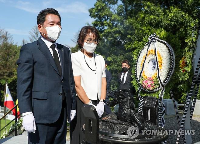 (춘천=연합뉴스) 1일 취임한 신경호 신임 강원도교육감이 첫 공식 일정으로 강원 춘천시 우두동 충렬탑을 찾아 아내와 함께 참배하고 있다. 2022.7.1 [강원도교육청 제공. 재판매 및 DB 금지]