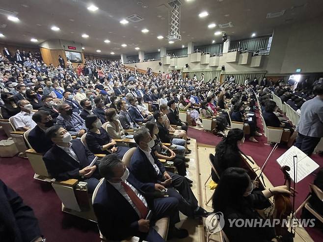 (부산=연합뉴스) 김선호 기자 = 1일 하윤수 부산교육감 취임식이 열린 부산교육청 대강당에 참석자들로 발 디딜 틈이 없다. 2022.7.1