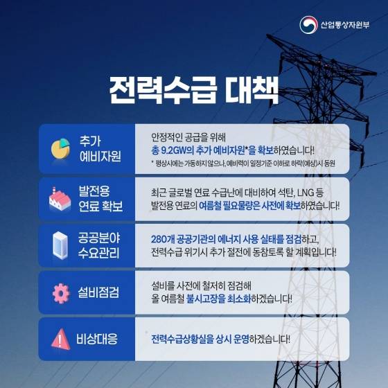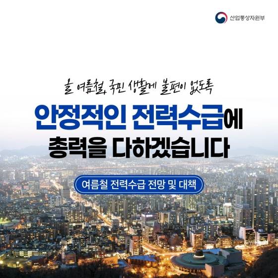 올 여름철, 국민 생활에 불편이 없도록 안정적인 전력 수급에 총력을 다하겠습니다.