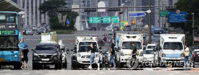 (서울=연합뉴스) 류영석 기자 = 1일 오후 폭염주의보가 발효 중인 서울 여의대로에 아지랑이가 피어오르고 있다.2022.7.1