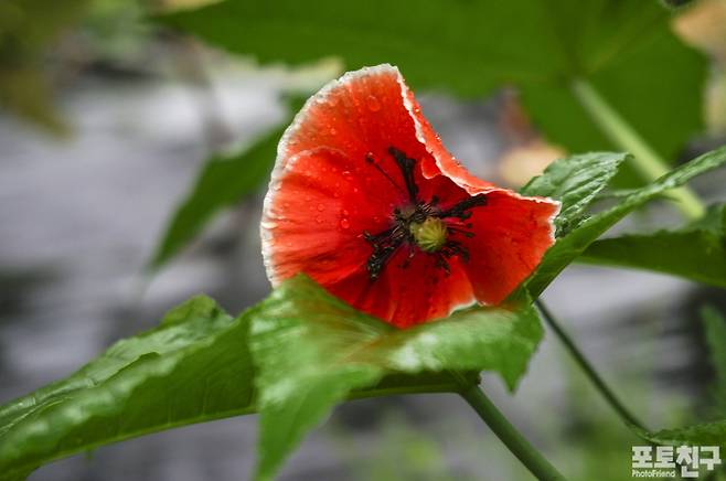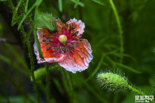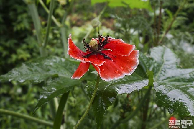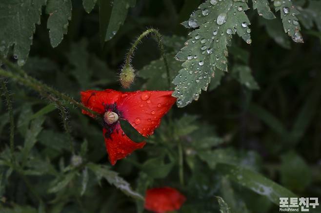 장마철에 핀 개양귀비 꽃 장맛비를 맞고 있습니다.