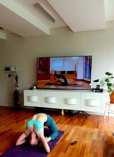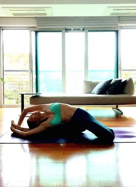 김지호는 티비 앞에 매트를 깔고 앉아 다양한 요가 동작을 선보였다.