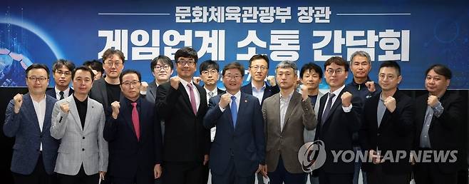 (서울=연합뉴스) 박보균 문화체육관광부 장관이 1일 서울 강남구 한국게임산업협회 회의실에서 게임업계 관계자들과 간담회 후 기념 촬영하고 있다. 2022.7.1 [문화체육관광부 제공. 재판매 및 DB 금지]