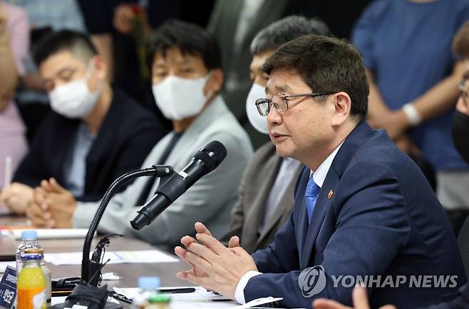 (서울=연합뉴스) 박보균 문화체육관광부 장관이 1일 서울 강남구 한국게임산업협회 회의실에서 게임업계 관계자들과 간담회 하고 있다. 2022.7.1 [문화체육관광부 제공. 재판매 및 DB 금지]