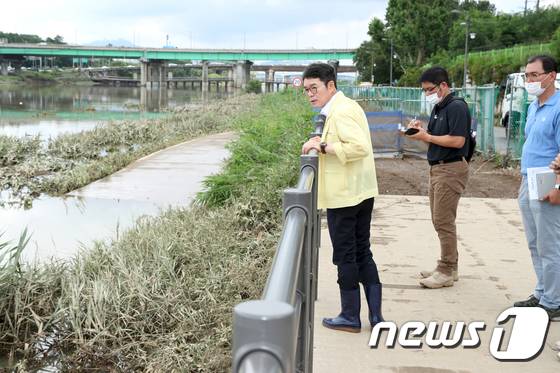 (서울=뉴스1) 김명섭 기자 = 정원오 성동구청장이 1일 오전 서울 성동구 내 중랑천변을 찾아 집중호우에 따른 피해 상황 등 긴급 점검하고 있다. (성동구청 제공) 2022.7.1/뉴스1