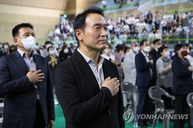 (남양주=연합뉴스) 임병식 기자 = 임태희 경기도교육감이 1일 경기도 남양주시 이패동 남양주체육문화센터에서 열린 민선5기 경기교육감 취임에 즈음한 경기교육 '소통' 콘서트에서 국민의례하고 있다. 2022.7.1