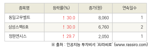 [fnRASSI]오늘의 상한가, 동일고무벨트 30.0% ↑
