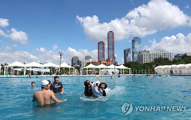 (서울=연합뉴스) 류영석 기자 = 1일 오후 폭염주의보가 발효 중인 서울 여의도 한강공원 수영장에서 시민들이 물놀이를 즐기고 있다.2022.7.1