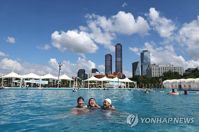 (서울=연합뉴스) 류영석 기자 = 1일 오후 폭염주의보가 발효 중인 서울 여의도 한강공원 수영장에서 시민들이 물놀이를 즐기고 있다.2022.7.1