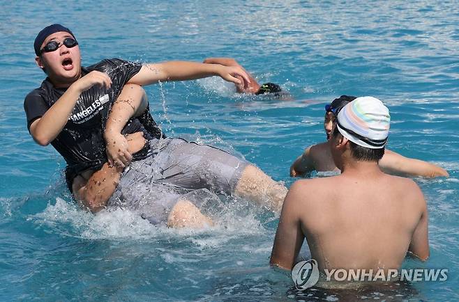 (서울=연합뉴스) 류영석 기자 = 1일 오후 폭염주의보가 발효 중인 서울 여의도 한강공원 수영장에서 시민들이 물놀이를 즐기고 있다.2022.7.1