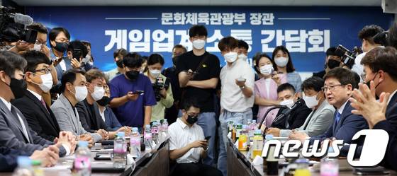 (서울=뉴스1) 김명섭 기자 = 박보균 문화체육관광부 장관이 1일 서울 강남구 한국게임산업협회 회의실에서 게임업계 관계자들을 만나 감담회를 갖고 규제혁신 및 향후 산업발전 방안에 대한 논의를 하고 있다. (문화체육관광부 제공) 2022.7.1/뉴스1