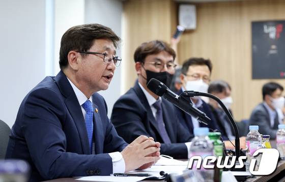 (서울=뉴스1) 김명섭 기자 = 박보균 문화체육관광부 장관이 1일 서울 강남구 한국게임산업협회 회의실에서 게임업계 관계자들을 만나 감담회를 갖고 규제혁신 및 향후 산업발전 방안에 대한 논의를 하고 있다. (문화체육관광부 제공) 2022.7.1/뉴스1