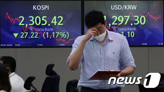 (서울=뉴스1) 박세연 기자 = 1일 서울 중구 하나은행 명동점 딜링룸 전광판에 코스피 지수가 전 거래일보다 27.22포인트(1.17%) 내린 2,305.42를 나타내고 있다. 코스닥은 전 거래일보다 15.96포인트(2.14%) 내린 729.48로 원/달러 환율은 전 거래일보다 1.1원 내린 1,297.3원에 거래를 마쳤다. 2022.7.1/뉴스1