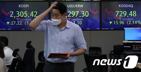 (서울=뉴스1) 박세연 기자 = 1일 서울 중구 하나은행 명동점 딜링룸 전광판에 코스피 지수가 전 거래일보다 27.22포인트(1.17%) 내린 2,305.42를 나타내고 있다. 코스닥은 전 거래일보다 15.96포인트(2.14%) 내린 729.48로 원/달러 환율은 전 거래일보다 1.1원 내린 1,297.3원에 거래를 마쳤다. 2022.7.1/뉴스1