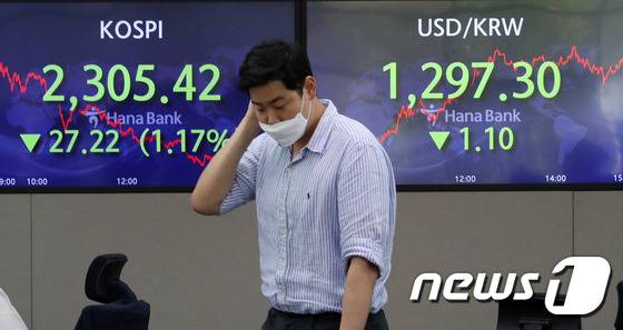 (서울=뉴스1) 박세연 기자 = 1일 서울 중구 하나은행 명동점 딜링룸 전광판에 코스피 지수가 전 거래일보다 27.22포인트(1.17%) 내린 2,305.42를 나타내고 있다. 코스닥은 전 거래일보다 15.96포인트(2.14%) 내린 729.48로 원/달러 환율은 전 거래일보다 1.1원 내린 1,297.3원에 거래를 마쳤다. 2022.7.1/뉴스1