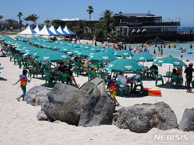 [제주=뉴시스] 오영재 기자 = 제주도 내 해수욕장이 일제 개장한 가운데, 1일 오후 제주시 조천읍 함덕해수욕장에 파라솔이 길게 늘어서 있다. 2022.07.01. oyj4343@newsis.com