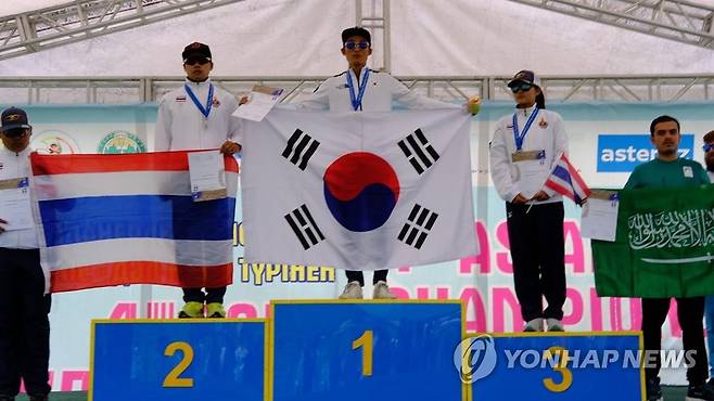 (서울=연합뉴스) 지난 22일부터 29일까지 카자흐스탄 탈디코르간에서 열린 '제4회 FAI 아시안 패러글라이딩 정밀착륙 챔피언십'에서 초대 주니어 챔피언에 등극한 유지훈 선수가 금메달을 목에 걸고 기념 촬영하고 있다. 2022.7.1 [대한체육회 제공. 재판매 및 DB 금지]