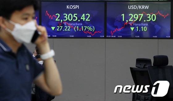(서울=뉴스1) 박세연 기자 = 1일 서울 중구 하나은행 명동점 딜링룸 전광판에 코스피 지수가 전 거래일보다 27.22포인트(1.17%) 내린 2,305.42를 나타내고 있다. 코스닥은 전 거래일보다 15.96포인트(2.14%) 내린 729.48로 원/달러 환율은 전 거래일보다 1.1원 내린 1,297.3원에 거래를 마쳤다. 2022.7.1/뉴스1