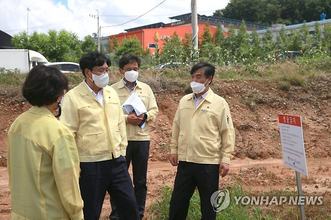 (서울=연합뉴스) 조재호 농촌진흥청장(왼쪽 두 번째)이 1일 경기도 화성시 향남읍을 찾아 과수화상병 공적 방제가 완료된 과수원에 대한 설명을 듣고 있다. 2022.7.1 [농촌진흥청 제공. 재판매 및 DB 금지]