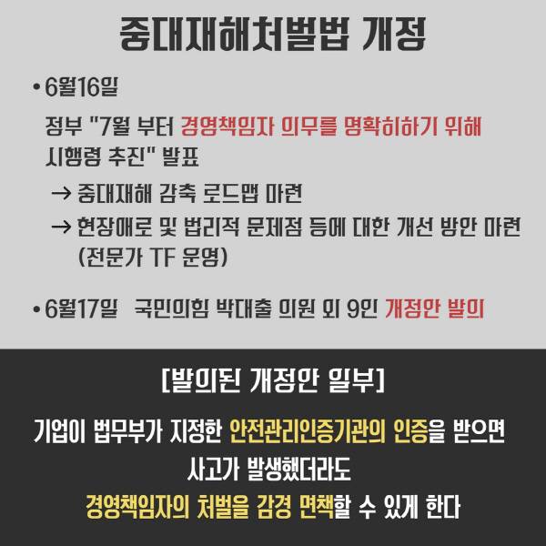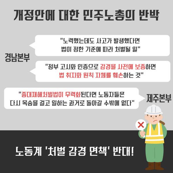 개정안 발의 후에도 노동계의 지적은 이어졌다. 발의된 개정안에는 “기업이 법무부가 지정한 안전관리인증기관의 인증을 받으면 사고가 발생했더라도 경영책임자의 처벌을 감경 면책할 수 있게 한다.”는 내용이 담겨있다. 이에 대해 민주노총이 반박하고 나선 것이다. 17일 민주노총 경남본부는 성명을 통해 “어떤 노력을 하더라도 중대재해가 발생하면 책임져야한다. 노력 했는데도 사고가 발생했다면 법이 정한 기준에 따라 처벌될 일이다”고 말했다. 이어 “정부 고시와 인증이라는 허울적 수단으로 중대재해 감경을 사전에 보증한다면 중대재해처벌법 취지와 원칙 자체를 훼손하는 것이다. 중대재해는 줄어들지 않을 것이다.”고 덧붙였다. 민주노총 제주본부도 기자회견을 통해 “중대재해처벌법이 무력화된다면 노동자들은 다시 목숨을 걸고 일하는 과거로 돌아갈 수밖에 없다”며 감경에 대한 반대의사를 밝혔다.