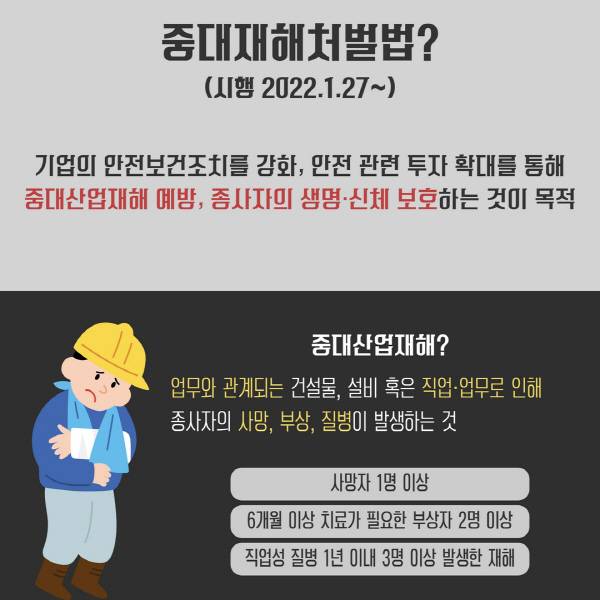 중대재해처벌법은 올해 1월27일에 시행된 법으로 기업의 안전보건조치를 강화하고 안전 관련 투자를 확대해 중대산업재해 예방, 종사자의 생명·신체를 보호하는 것을 목적으로 한다. 중대산업재해란 업무와 관계되는 건설물, 설비 혹은 작업 또는 업무로 인해 발생하는 종사자의 사망, 부상, 질병이 발생하는 것을 말한다. ‘사망자 1명 이상’, ‘6개월 이상 치료가 필요한 부상자 2명 이상’, ‘직업성 질병이 1년 이내 3명 이상 발생한 재해’가 중대산업재해에 해당된다.