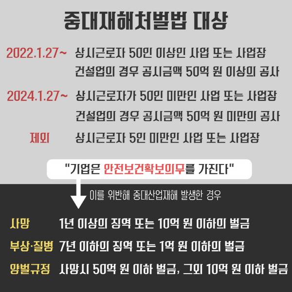 이를 위반해 중대산업재해가 발생할 경우 사망에 대해선 ‘1년 이상의 징역 또는 10억 원 이하의 벌금’, 부상·질병에 대해서는 7년 이하의 징역 또는 1억 원 이하의 벌금‘이 경영책임자에게 부과된다. 중대재해처벌법은 현재 상시근로자 ’50인 이상인 사업 또는 사업장‘, ’건설업의 경우 공시금액 50억 원 이상인 공사’ 가 대상이다. 50인 미만인 사업 또는 사업장은 2024년1월27일부터 시행되며, 상시근로자 5인 미만인 사업 또는 사업장은 처벌 대상에서 제외된다.
