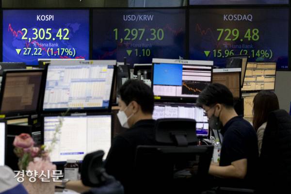 코스피가 장중 2300선이 무너진 1일 서울 중구 하나은행 딜링룸에서 직원들이 업무를 보고 있다. 이날 코스피는 전장보다 1.17% 하락하며 2305.42로, 코스닥 지수는 전장보다 2.14% 하락한 729.48로 마감했다. 서울 외환시장에서 원·달러 환율은 전 거래일 대비 1.10원 내린 1297.30원으로 거래를 마쳤다.