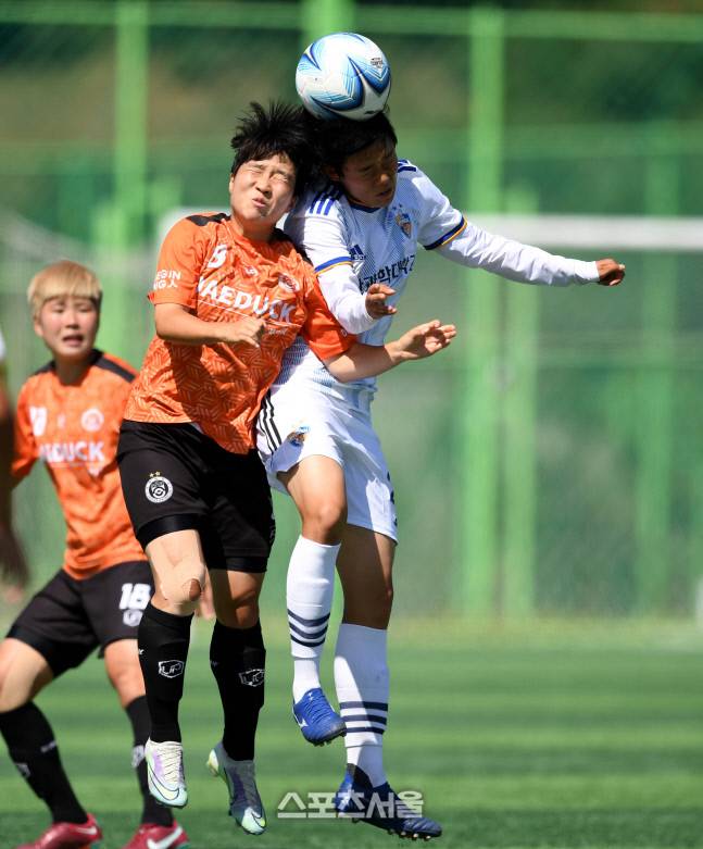 대덕대 이다연(왼쪽)이 1일 삼척복합체육공원에서 열린 제30회 여왕기 전국여자축구대회 울산과학대와 경기에서 상대 황아현과 공중볼 다툼을 하고 있다.