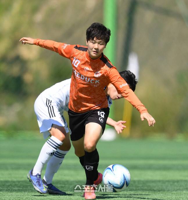 대덕대 고다영이 1일 삼척복합체육공원에서 열린 제30회 여왕기 전국여자축구대회 울산과학대와 경기에서 볼을 뺏고 있다.