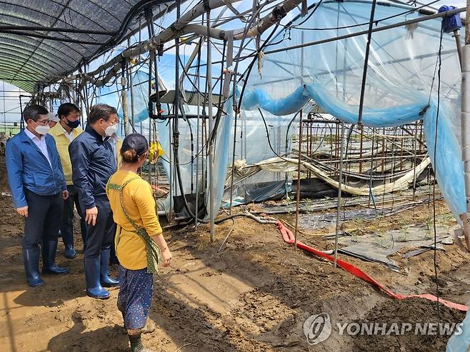 (서울=연합뉴스) 이재식 농협중앙회 부회장이 1일 경기 평택지역 집중 호우 피해농가를 방문해 시설하우스 침수피해 현장을 점검하고 있다. 2022.7.1 [농협 제공. 재판매 및 DB 금지]