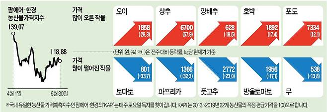 KAPI의 예측 모델에 따르면 오이 가격 상승세는 8월 중순까지 이어질 전망이다. 오이는 일조량이 부족한 장마철은 물론 무더운 한여름에도 출하량이 줄어들기 때문이다.