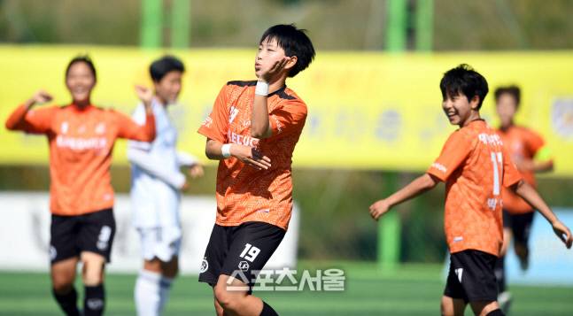 대덕대 노하늘이 1일 삼척복합체육공원에서 열린 제30회 여왕기 전국여자축구대회 울산과학대와 경기에서 골을 넣은 후 환호하고 있다.