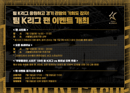 팬 사인회 및 오픈 트레이닝 참가 신청은 7월 1일부터 8일까지 연맹 SNS에 공지된 별도 양식을 통해 '팀 K리그 팬 이벤트 신청 사연' 등을 적어 응모할 수 있다. 응모 결과는 8일 오후 개별공지된다. 초청된 팬들에게는 행사 당일 추첨을 통해 ‘쿠팡플레이 시리즈’ 1차전 티켓을 팬 사인회, 오픈 트레이닝 초청자 중 10명씩 20명을 선정, 1인당 2장씩 총 40장 증정한다.