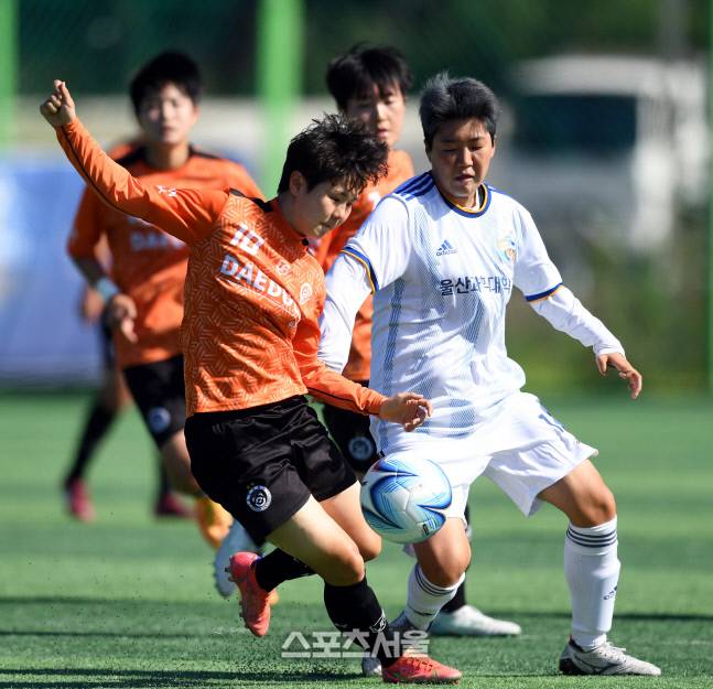 대덕대 고다영이 1일 삼척복합체육공원에서 열린 제30회 여왕기 전국여자축구대회 울산과학대와 경기에서 상대와 볼다툼을 하고 있다.
