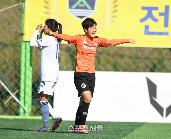 대덕대 고다영이 1일 삼척복합체육공원에서 열린 제30회 여왕기 전국여자축구대회 울산과학대와 경기에서 골을 넣은 후 환호하고 있다.