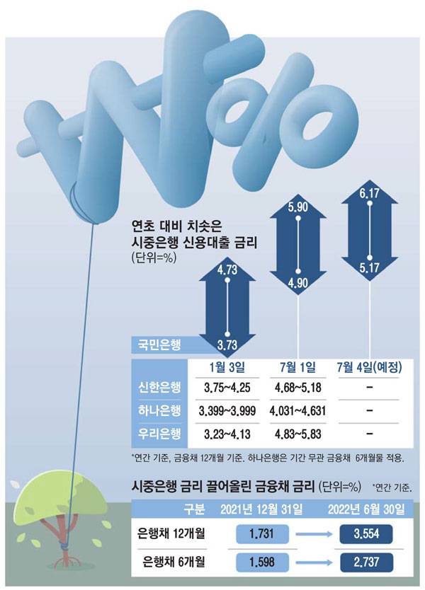 특히 금융시장 참가자들은 한국은행 금융통화위원회가 오는 13일 열리는 통화정책방향 결정회의에서 기준금리를 0.5%포인트 올릴 가능성을 높게 보고 있어 신용대출 위주로 가계대출 금리가 더 뛸 것으로 예상된다.