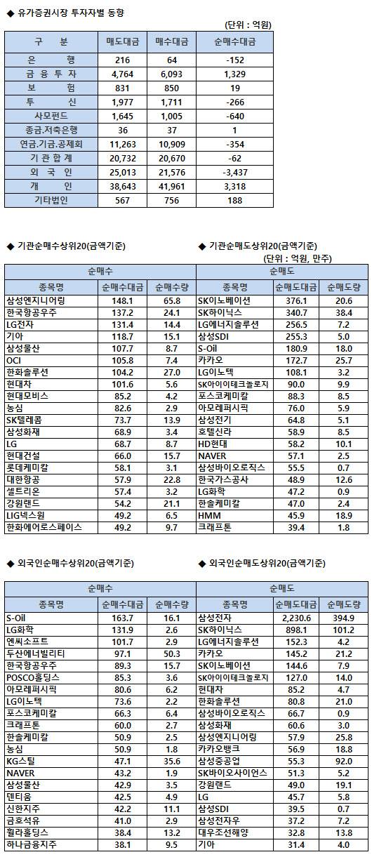 [표]코스피 기관/외국인 매매동향(7/1 3시30분)