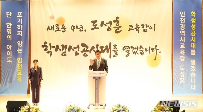 [인천=뉴시스] 김동영 기자 = 도성훈 인천시교육감이 1일 오후 인천시 남동구 구월동 인천시교육청 대회의실에서 열린 취임식에서 취임 선서를 하고 있다. 2022.07.01. dy0121@newsis.com