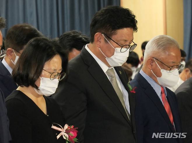 [인천=뉴시스] 김동영 기자 = 도성훈 인천시교육감이 1일 오후 인천시 남동구 구월동 인천시교육청 대회의실에서 열린 취임식에서 묵렴을 하고 있다. 2022.07.01. dy0121@newsis.com