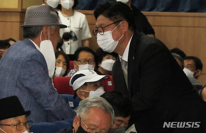 [인천=뉴시스] 김동영 기자 = 도성훈 인천시교육감이 1일 오후 인천시 남동구 구월동 인천시교육청 대회의실에서 열린 취임식에서 내빈과 인사를 나누고 있다. 2022.07.01. dy0121@newsis.com