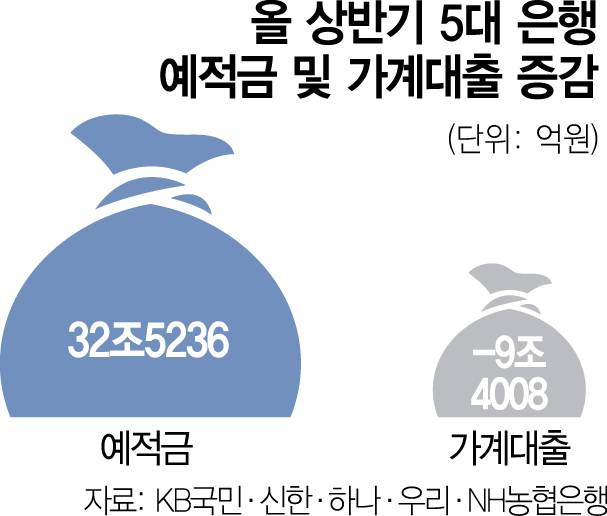 올해 상반기 5대 시중은행에서 예적금 잔액이 크게 늘고 가계대출 잔액은 다달이 줄어든 것으로 나타났다.