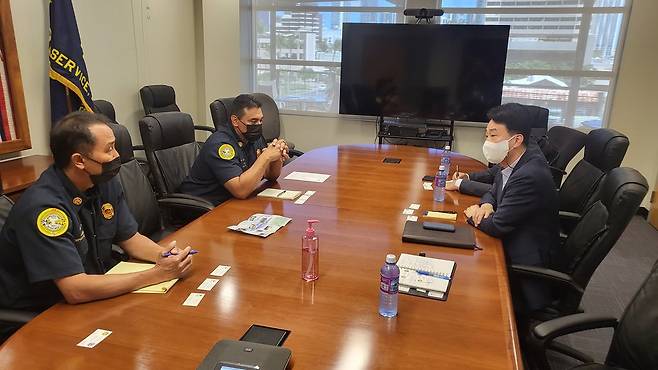 (서울=연합뉴스) 외교부가 미국 하와이주를 방문하는 한국 여행객 증가에 대비해 지난달 28∼30일 재난대비 모의훈련 실시 및 현지 재난 책임자와 면담했다고 1일 밝혔다. 사진은 하와이 재난 대응 관계자 면담하는 외교부 관계자. 2022.7.1 [외교부 제공. 재판매 및 DB 금지]