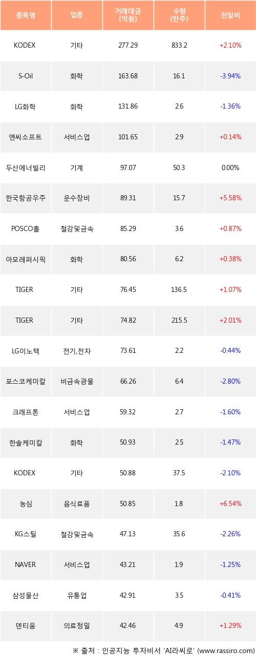 KODEX 200선물인버스2X, 엔씨소프트, 한국항공우주 등은 전일 대비 주가가 상승했고, S-Oil, LG화학, LG이노텍 등은 주가가 하락했다.