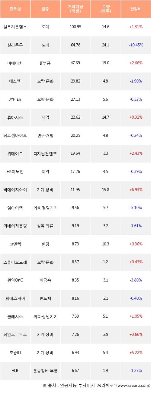 셀트리온헬스케어, 비에이치, 휴마시스 등은 전일 대비 주가가 상승했고, 실리콘투, 에스엠, JYP Ent. 등은 주가가 하락했다.