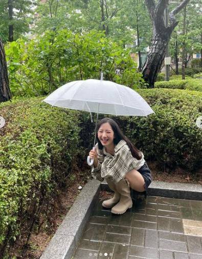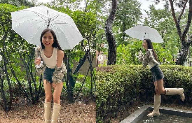 우산을 쓰고 레인부츠로 멋을 낸 보나는 슬렌더 몸매와 웃는 모습도 눈부신 상큼발랄 매력을 뽐내고 있다.
