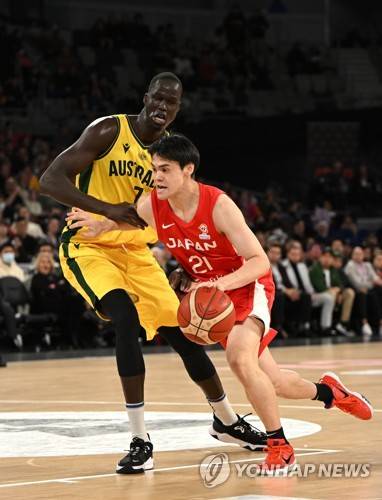 epa10045255 Yuma Fujii (R) of Japan in action against Thon Maker (L) of Australia during the FIBA Basketball World Cup qualification match between Japan and Australia at John Cain Arena in Melbourne, Australia, 01 July 2022. EPA/JOEL CARRETT