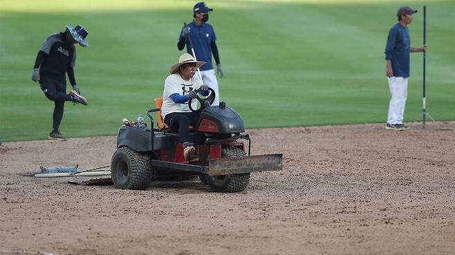 NC파크에는 경기 시작 무렵 비가 내리지 않았지만, 전날부터 이날 오전까지 폭우가 쏟아져 경기장이 잔뜩 젖은 상태였습니다.