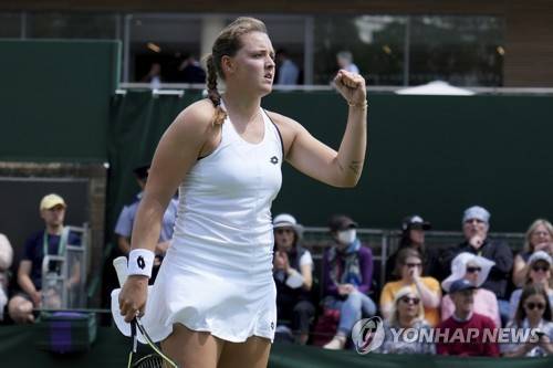 Germany's Jule Niemeier celebrates winning a point against Ukraine's Lesia Tsurenko in a third round women's singles match on day five of the Wimbledon tennis championships in London, Friday, July 1, 2022. (AP Photo/Alberto Pezzali)