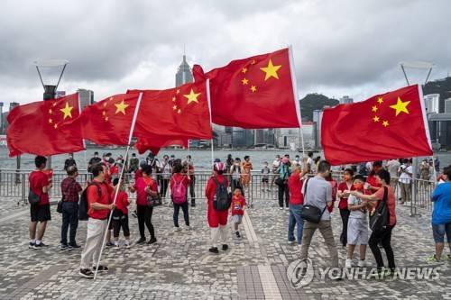 epa10045358 Supporters of China hold People's Republic of China flags as they gather at the Victoria Harbour in Hong Kong, China, 01 July 2022. The Chinese president is visiting the city to mark the 25th Anniversary of the establishment of the Hong Kong Special Administrative Region (HKSAR) of the People?s Republic of China. EPA/MIGUEL CANDELA