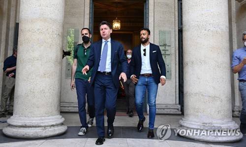 epa10045379 The president of the 5-Star Movement (M5S), Giuseppe Conte (C) departs at the end of the CGIL (Trade Union) 'Il Lavoro interroga' event, in Rome, Italy, 01 July 2022. EPA/ETTORE FERRARI